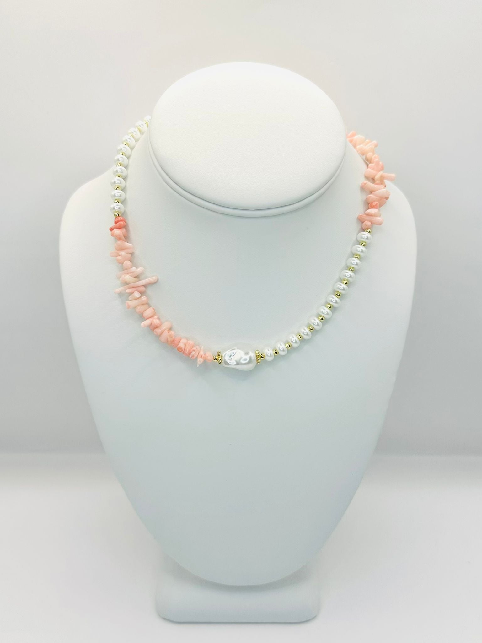 Más ceñida al cuello, esta pieza delicada utiliza pequeñas cuentas de coral y perlas, dispuestas en un patrón simétrico o alternado. Perfecta para lucir con escotes abiertos o vestidos formales, la gargantilla realza la línea del cuello con un toque refinado y natural. Puede incluir un colgante central, una gota de coral o una perla más grande como punto focal.